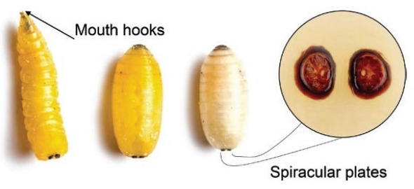 Gambar 3 Kiri ke kanan : instar ketiga berwarna kuning terang (6-10 mm), pre-pupa kuning, dan puparium yang terkalsifikasi yang didalamnya mengandung pupa