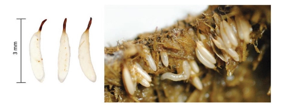Gambar 2 Telur lalat wajah (kiri) dengan stalk respiratori berwarna cokelat yang masuk kedalam permukaan kotoran. Instar pertama (kanan) tengah menggali bagian kotoran