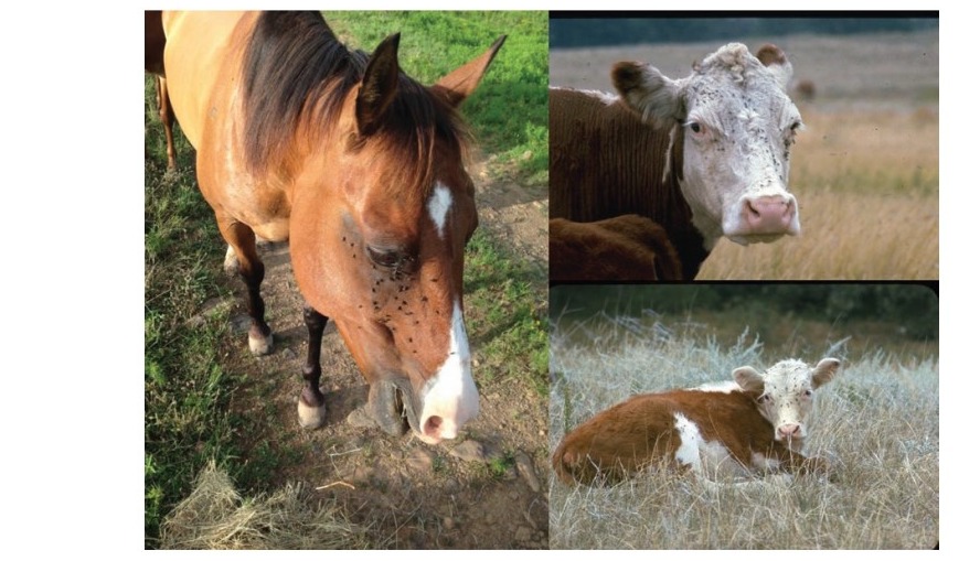 Gambar 4 Lalat wajah tengah mencari makan di area mata dan sekresi wajah dari kuda, sapi, dan anak sapi